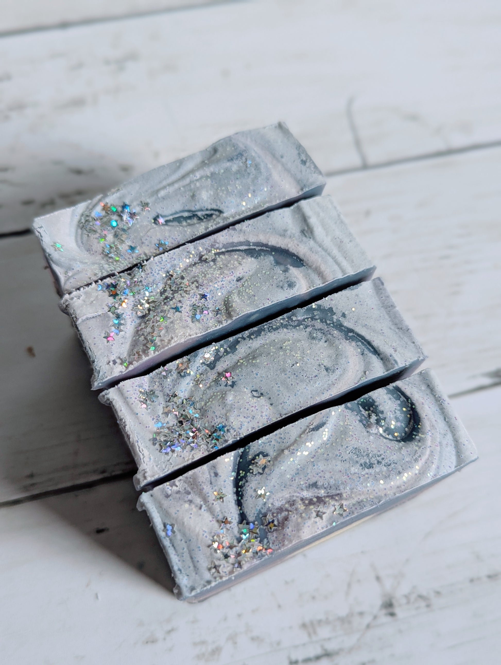 Ingredients: Olive Oil, Distilled Water, Coconut Oil, Palm Oil, Sodium Hydroxide (Lye), Sweet Almond Oil, Castor Oil, Goat Milk, Fragrance Oil, Kaolin Clay, Salt, Mica Powders, Titanium Dioxide